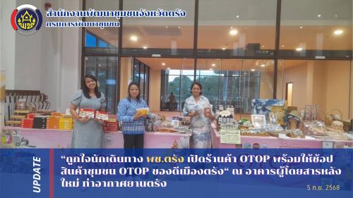 การจัดแสดงและจำหน่ายสินค้าชุมชน OTOP ของดีเมืองตรัง ณ อาคารผู้โดนสารหลังใหม่ ท่าอากาศยานตรัง ถือเป็นการส่งเสริมช่องทางการตลาดให้ผู้ประการ OTOP ตรัง มีช่องทางการจำหน่ายให้สามารถจำหน่ายสินค้าได้เพิ่มขึ้น ทั้งนี้ ผู้เดินทางสามารถเลือกซื้อสินค้า เพื่อเป็นของฝากที่มีเอกลักษณ์ สัมผัสกับคุณค่าของผลิตภัณฑ์ชุมชน ช่วยเพิ่มรายได้สู่ชุมชน กระตุ้นเศรษฐกิจฐานรากของจังหวัดตรังได้อย่างยั่งยืน