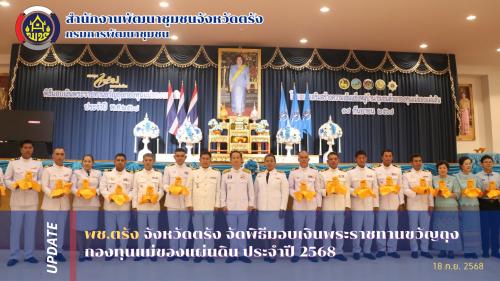 วันที่ 18 กันยายน 2568 ณ หอประชุมจังหวัดตรัง อำเภอเมืองตรัง จังหวัดตรัง นายทรงกลด สว่างวงศ์ ผู้ว่าราชการจังหวัดตรัง เป็นประธานในพิธีมอบเงินพระราชทานขวัญถุงกองทุนแม่ของแผ่นดิน ประจำปี 2568 โดยมี นางสาวนวภัทร หอมหวล พัฒนาการจังหวัดตรัง กล่าวรายงานต่อประธานในพิธี พร้อมด้วยผู้อำนวยการสำนักงานป้องกันและปราบปรามยาเสพติด ภาค 9 นายอำเภอ หัวหน้าส่วนราชการ ผู้แทนองค์กรปกครองส่วนท้องถิ่น กำนัน ผู้ใหญ่บ้าน คณะกรรมการและเครือข่ายกองทุนแม่ของแผ่นดิน เข้าร่วมพิธีอย่างพร้อมเพรียง